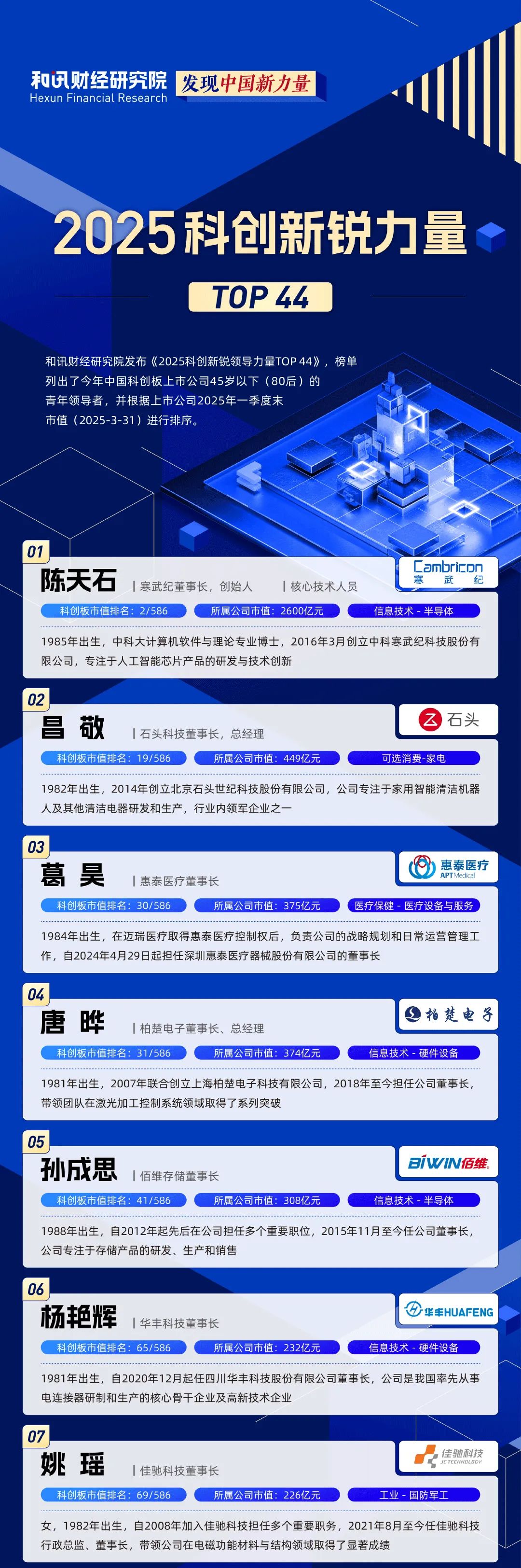和讯财经研究院发布《2025年中国科创新锐力量榜》,榜单列出了今年中国科创板上市公司45岁以下(80后)的青年领导者,并根据上市公司2025年一季度末市值(2025-3-21)进行排序。